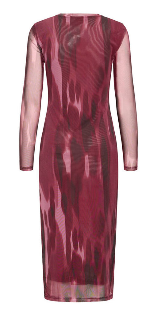 The b.young PALOMA Mesh Dress features a striking abstract print in rich berry tones. Designed with long sleeves and a fitted silhouette, it’s made from lightweight stretch mesh with a soft slip lining for comfort. Perfect for layering or evening wear.