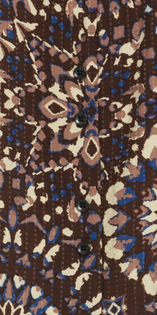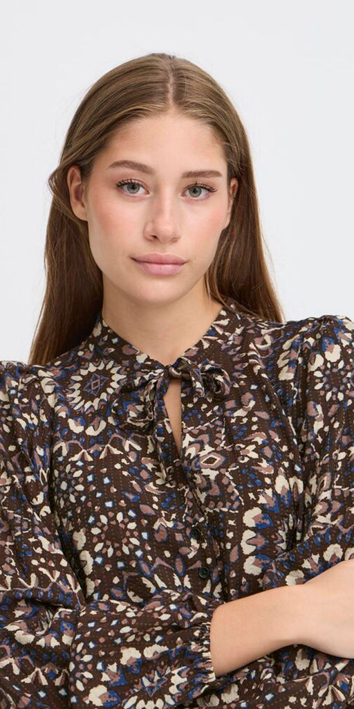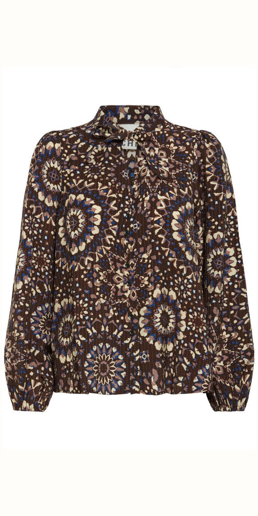 Add a touch of effortless boho style to your wardrobe with the ICHI CRAVIZ shirt. Featuring an intricate mandala-inspired print in earthy tones of brown, cream and blue, this relaxed-fit blouse offers soft volume through the sleeves and a flattering tie-neck detail. Perfect for pairing with tailored trousers or denim for a chic everyday look. Oversize fit.
