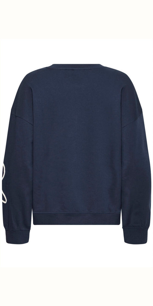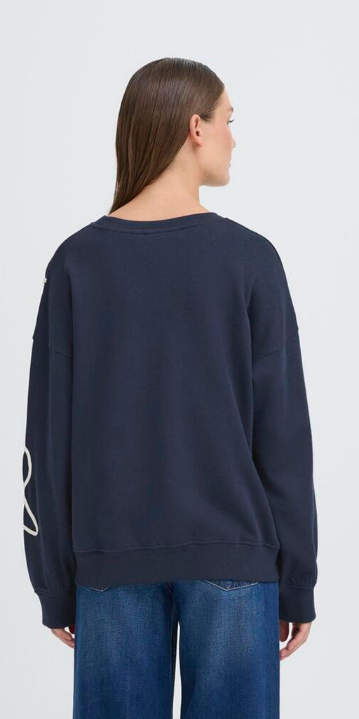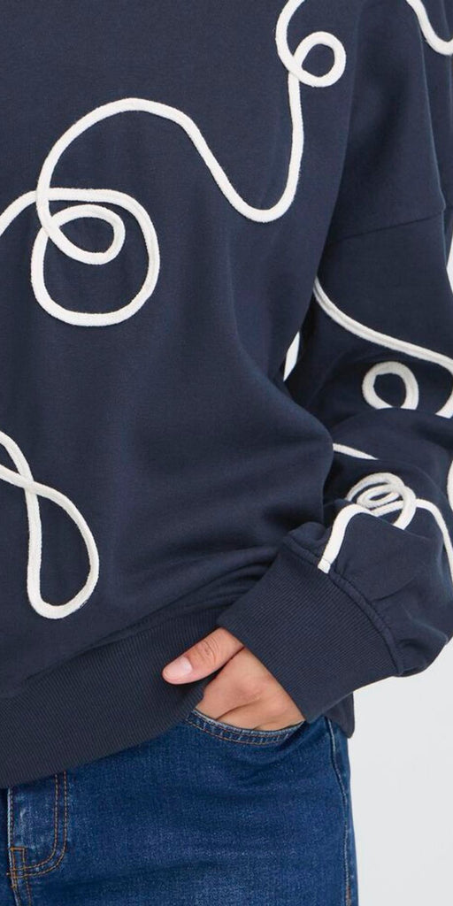 The KASURA Sweatshirt by ICHI is a contemporary twist on casual comfort. Crafted from soft cotton blend fabric, it features an oversized fit with a playful white swirl design across the front and sleeves. Perfect for relaxed days, it pairs effortlessly with jeans or tailored trousers for a modern off-duty look.