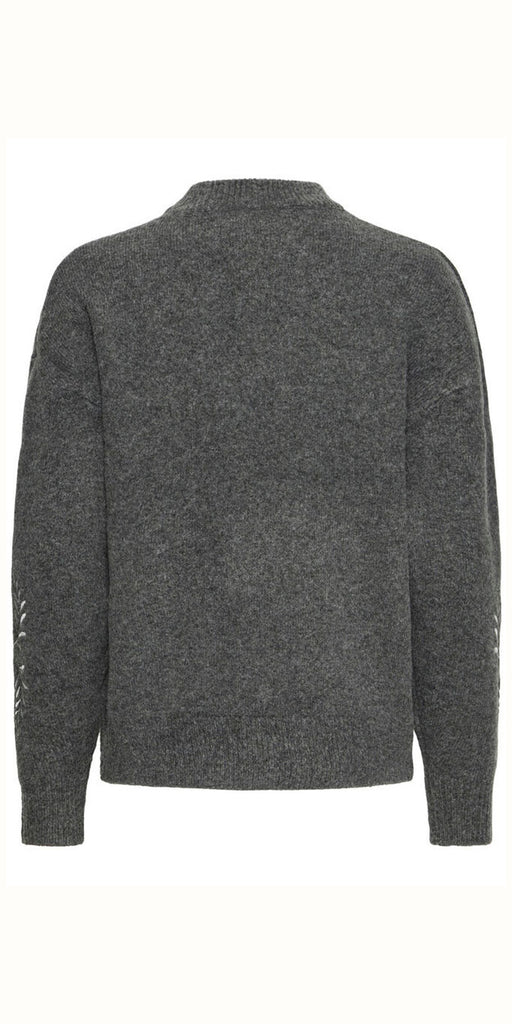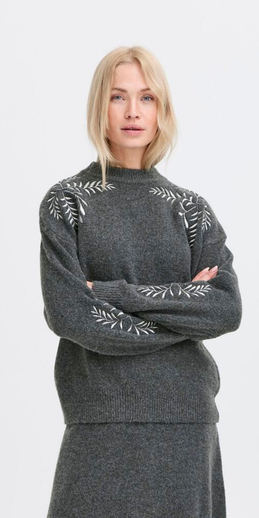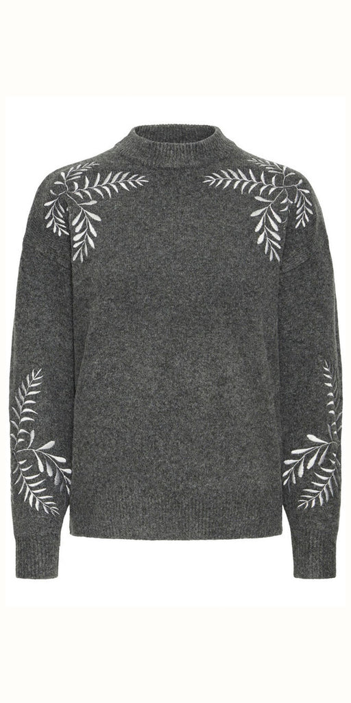 Stunning dark grey melange soft knit by b young, with silver grey embroidered detailing. This is so beautiful and feels incredible on. Style with jeans, skirts or tailored trousers. True to size.