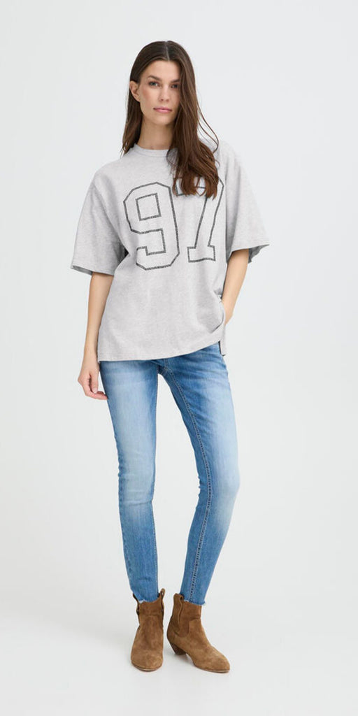 Sporty, relaxed, and effortlessly cool — the ARYA tee, by PULZ Jeans, features an oversized fit and bold varsity-style “97” graphic on soft grey cotton. Perfect for laid-back days, this easy throw-on style pairs seamlessly with denim for an off-duty look with attitude.