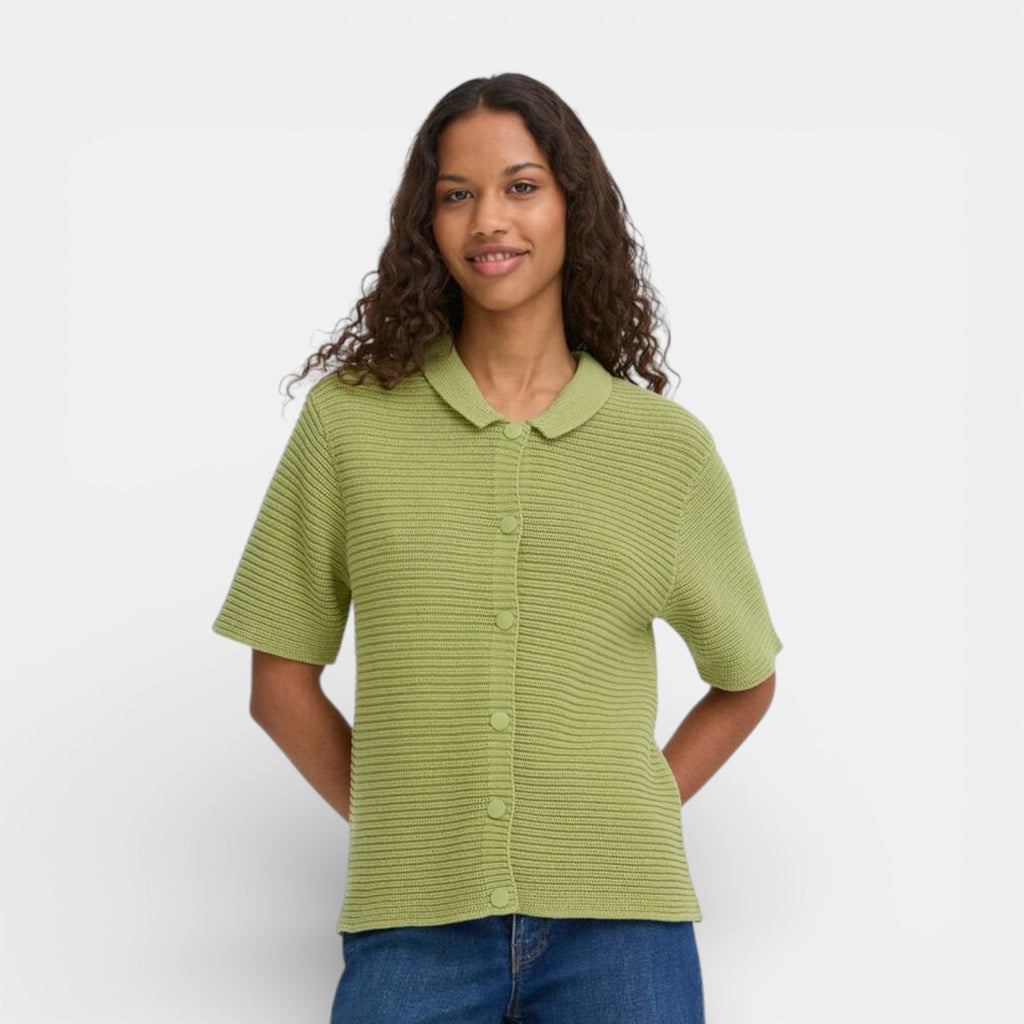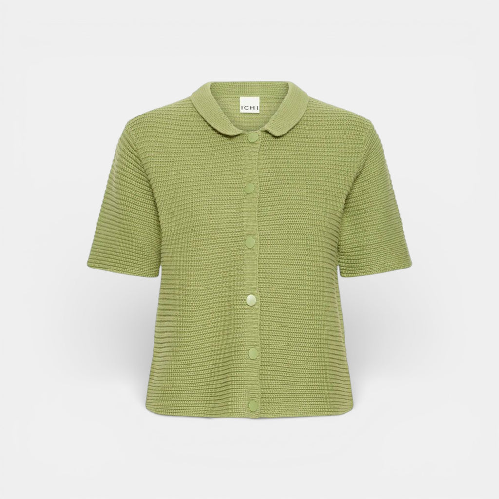 The ICHI DEMUE Cardigan in Iguana is a fresh, modern knit with a soft textured finish. Designed with short sleeves, a classic collar, and button-front fastening, it offers a flattering silhouette that works beautifully for everyday wear.