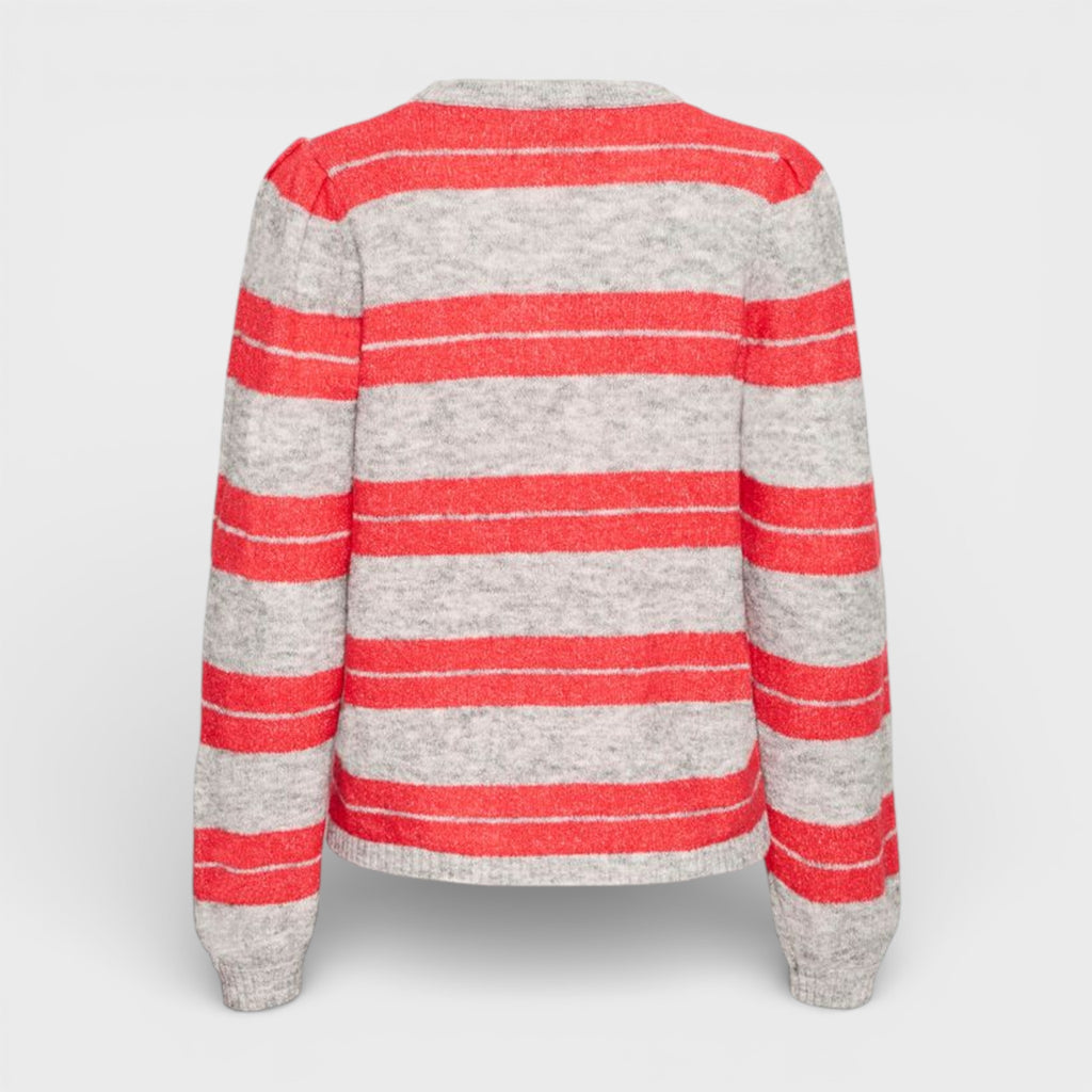 The ICHI Dusty Knit in grey is a standout jumper designed to add colour and comfort to your everyday wardrobe. Featuring bold horizontal stripes in bright raspberry and neutral grey, this soft knit has a relaxed fit and classic crew neckline for easy, flattering wear. Lightweight yet cosy, it’s ideal for layering or wearing on its own through the seasons.