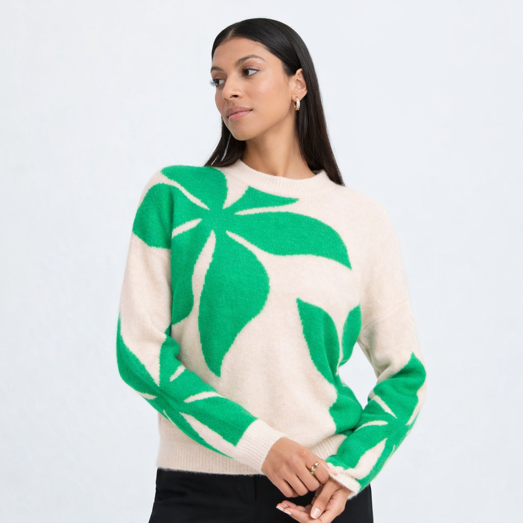 Striking and super soft vibrant green floral knit by b young. Lightweight yet cosy and a versatile dress up or down piece.