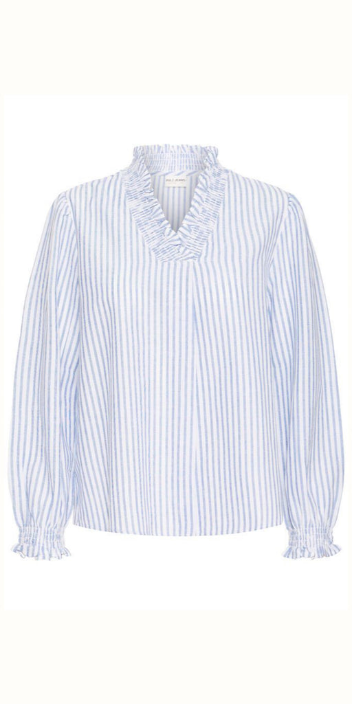 The AUDREY blouse, by PULZ Jeans, offers effortless femininity with its soft blue stripes, ruffled neckline, and gently gathered sleeves. Light, airy, and beautifully detailed, it’s the perfect piece for elevating everyday denim or pairing with tailored separates for a fresh, polished look.