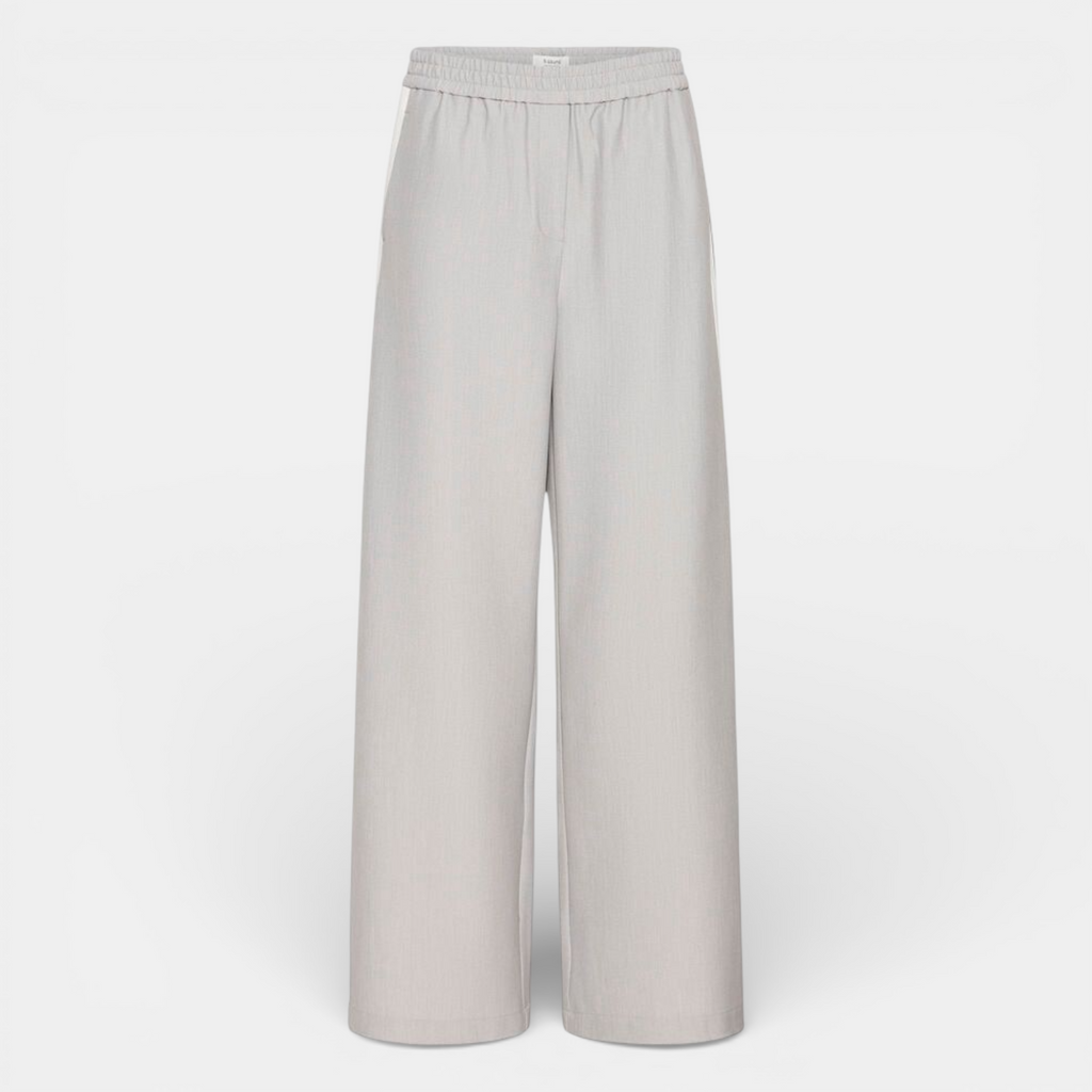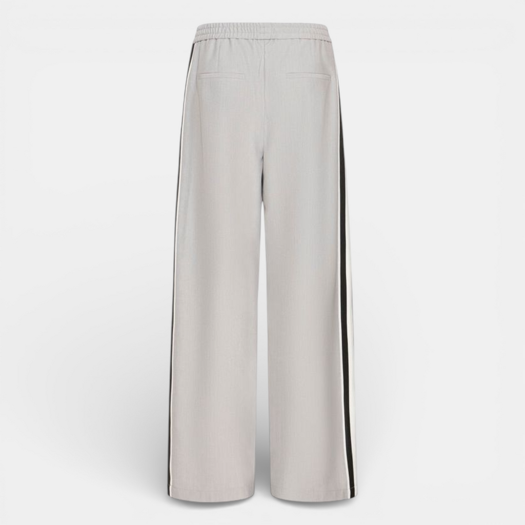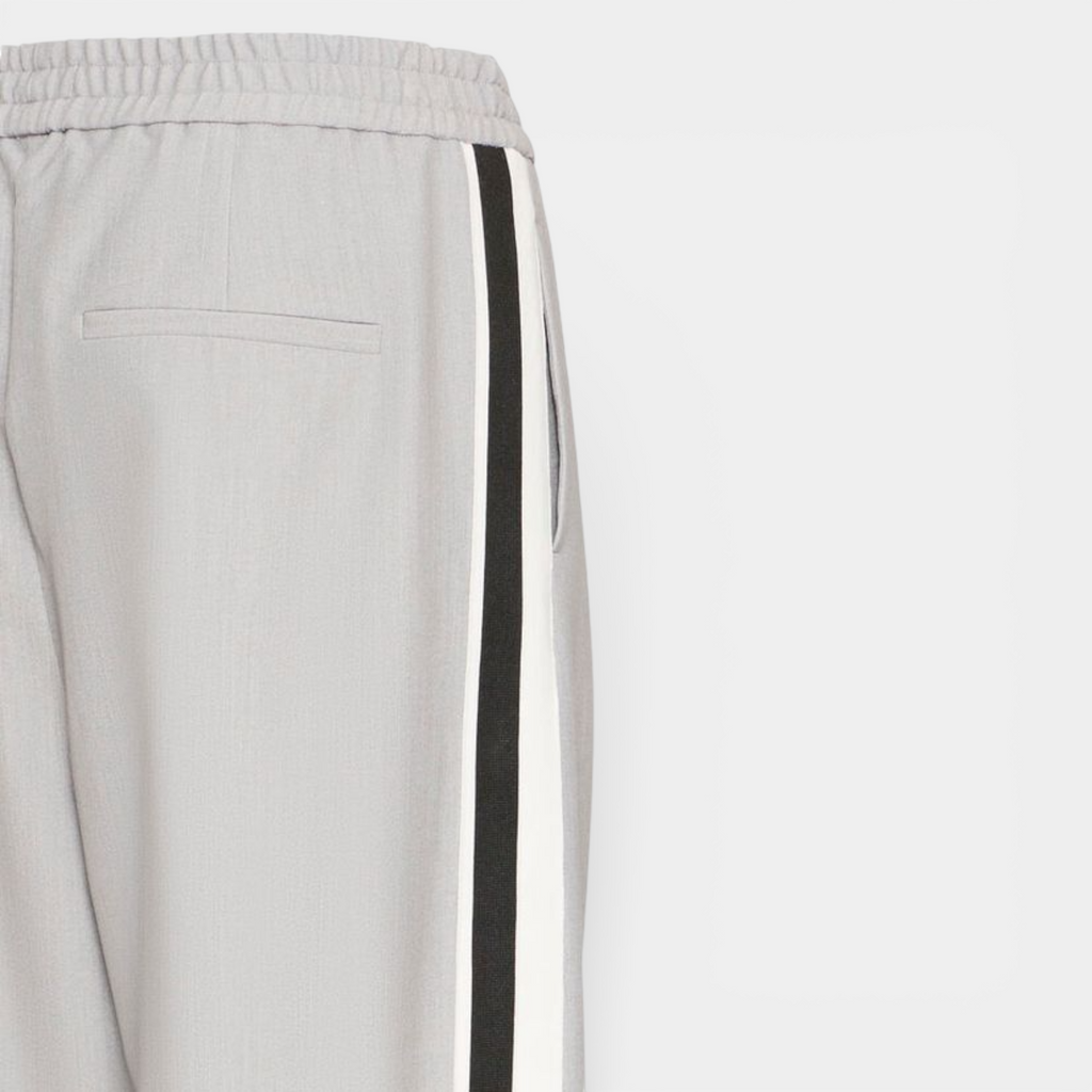 On trend and very stylish grey trouser by b young, with white and black stripe detail to the outer leg. Versatile dress up or down trousers.