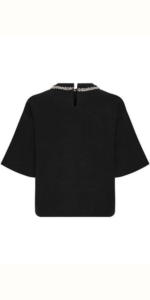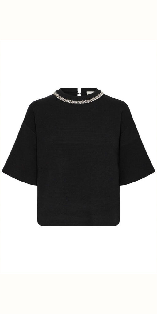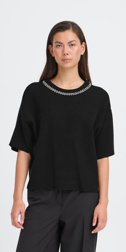 Luxurious, elegant and timeless black boxy fit short sleeve knit by ICHI, with stunning diamanté detailing to the neckline. Great one to team with jeans, skirts or tailored trousers.