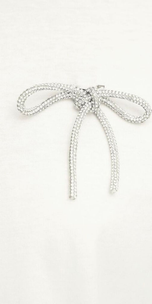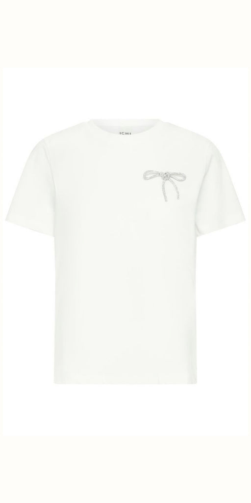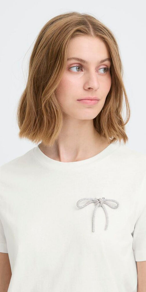 The KAMILLE T-Shirt by ICHI is just gorgeous. A crisp white cotton embellished with a removable diamanté bow brooch. Team with a pair of jeans, leather look skirt or tailored trouser.