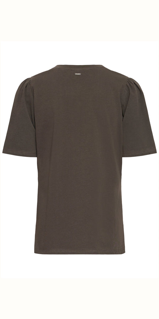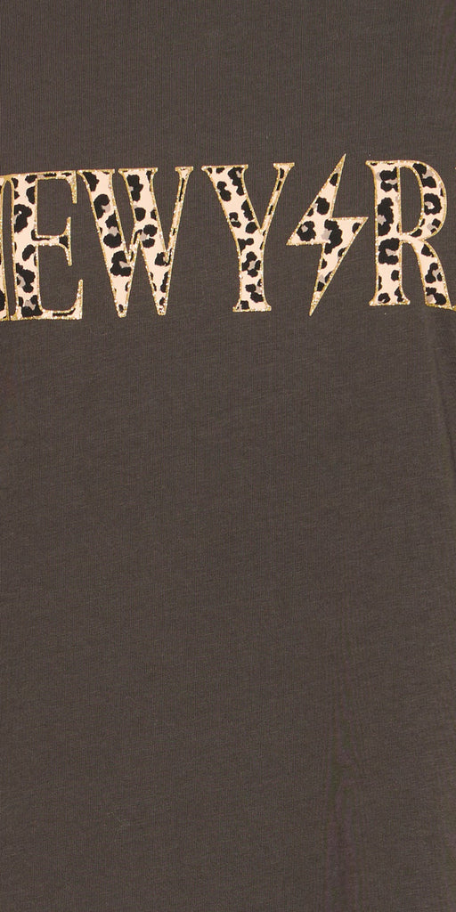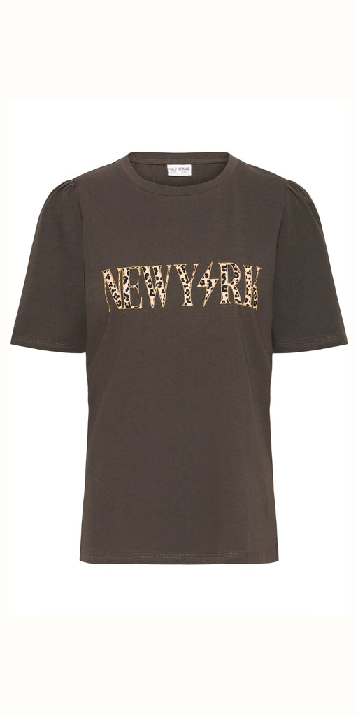 Striking and fun chocolate brown ‘New York’ leopard print slogan t shirt by PUKZ Jeans, with pretty structured short sleeves. Gorgeous with denim and a biker jacket.