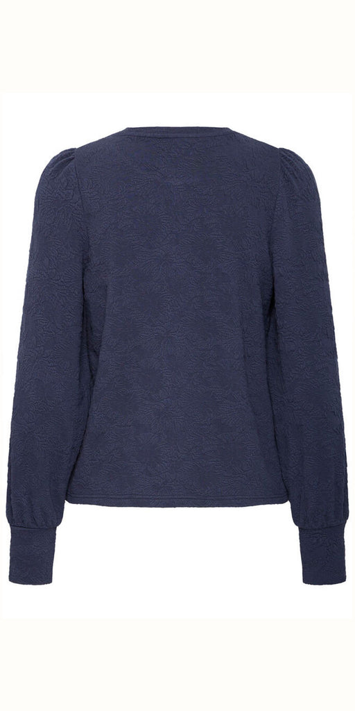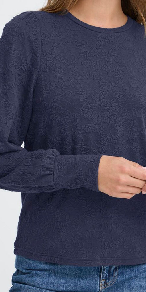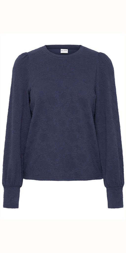 Gorgeous textured, jacquard fabric long sleeve top by PUKZ Jeans, with flattering structure to the shoulders and cuffed sleeves. Style with a lighter colour Jean like the LOETTA mid blue. Generous fit.